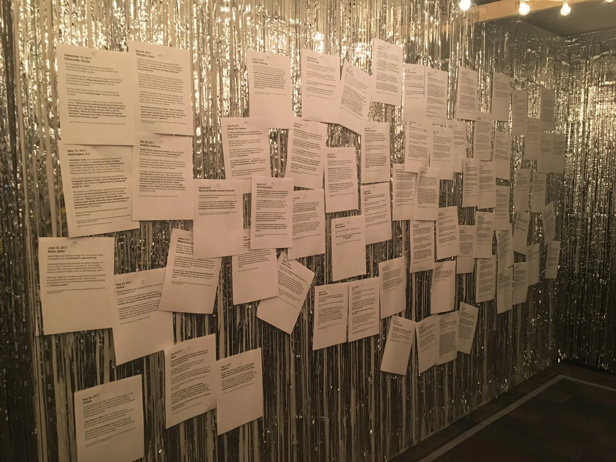Throughout the space, I overlap symbols of nationalism, protest, and queerness. An American flag and a rainbow flag appear side by side, echoed by a video of both flags waving their patriotism and pride in an endless loop. A photograph titled The Anthem depicts each brother wearing the Society’s ritual robe while singing “The Star-Spangled Banner” and either standing or kneeling in postures inspired by athlete-led protests against racial injustice. Rather than presenting unanimity, the image reveals internal difference, positioning dissent as an essential part of collective identity. The room is further layered with historical references, from printed summaries of global acts of injustice to a quote written on a mirror with lipstick reminding visitors that history must be confronted rather than concealed. A locked door labeled “Brothers Only” withholds access even as the installation invites everyone to enter. In Society of 23’s Locker Dressing Room, I treat masculinity, power, and belonging as performances that only exist through repetition, practice, and rehearsal.
